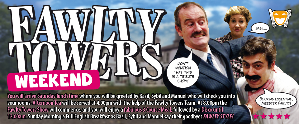 You will arrive Saturday lunch time where you will be greeted by Basil, Sybil and Manuel who will check you into your rooms. Afternoon Tea will be served at 4.00pm with the help of the Fawlty Towers Team. At 8.00pm the Fawlty Towers Show will commence, and you will enjoy a fabulous 3 Course Meal, followed by a Disco until 12.00am.