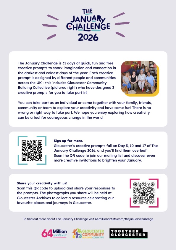 The January Challenge is 31 days of quick, fun and free creative prompts to spark imagination and connection in the darkest and coldest days of the year. Each creative prompt is designed by different people and communities across the UK - this includes Gloucester Community Building Collective who have designed 3 creative prompts for you to take part in! You can take part as an individual or come together with your family, friends, community or team to explore your creativity and have some fun! There is no wrong or right way to take part.