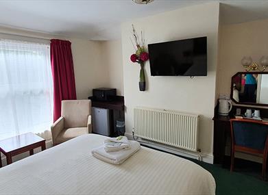 The Edward Hotel is a just 10-minute walk from Gloucester Cathedral and Gloucester Train Station. Set in 3 historically listed town houses, it offers en suite rooms with free Wi-Fi, traditional breakfasts and free parking. Rooms at the Edward Hotel feature a flat-screen TV with FreeSat, a writing desk, and a hairdryer. Each also comes with tea and coffee making facilities. The hotel has a self-serviced kitchenette free to all guests. In reception guests can use the computer, which has Skype and a webcam, free of charge. The corridors are lined with photographs of Gloucester’s historic buildings, and the friendly staff can arrange transport and sightseeing recommendations. Gloucester Rugby Club is less than one mile from the Edward. Gloucester city centre has a good range of shops, bars and restaurants and is a 10-minute walk away. The Edward Hotel has a safe lockup for cycles. Good off-road cycling and three golf clubs and are within a 5-mile radius of the hotel. Gloucester Airport and junctions 11 and 11a of the M5 motorway are within a 10-minute drive.